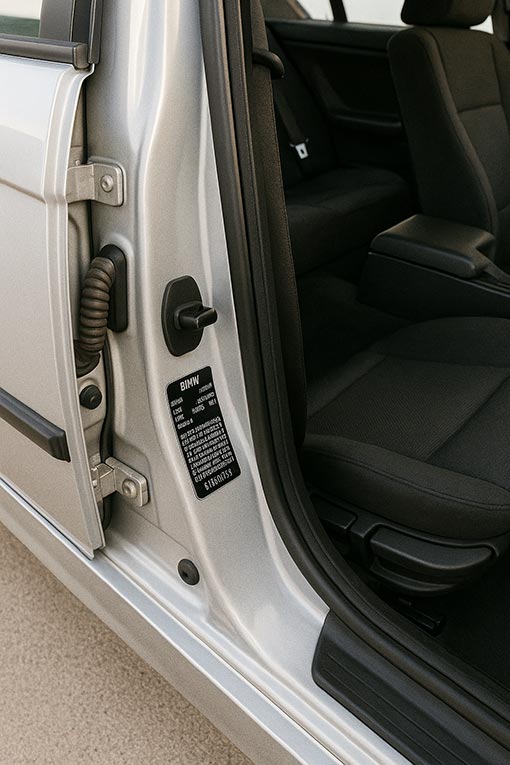 This VIN plate is fixed directly to the body, making it one of the most reliable spots to confirm a vehicle’s identity. It’s often used during inspections, especially for imported or restored cars.