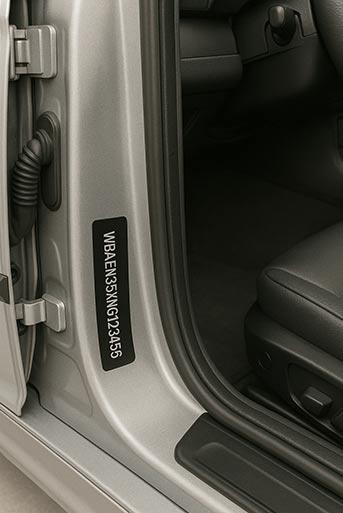 Open the driver’s door and look along the inner frame or B-pillar. You’ll find a black or silver sticker showing the BMW E46 VIN, usually printed above the bar code. This label may also include details like the build date, weight ratings, and country of manufacture. It’s the most accessible VIN location and is often used for registration or inspection checks.