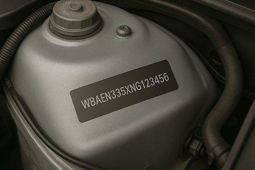 Open the hood and check the passenger side front strut tower inside the engine bay. The BMW E46 VIN is stamped directly into the metal or displayed on a small riveted plate. This location is permanent and confirms the car’s original chassis number. It’s often checked during inspections or when verifying that the vehicle hasn’t been tampered with or rebuilt.